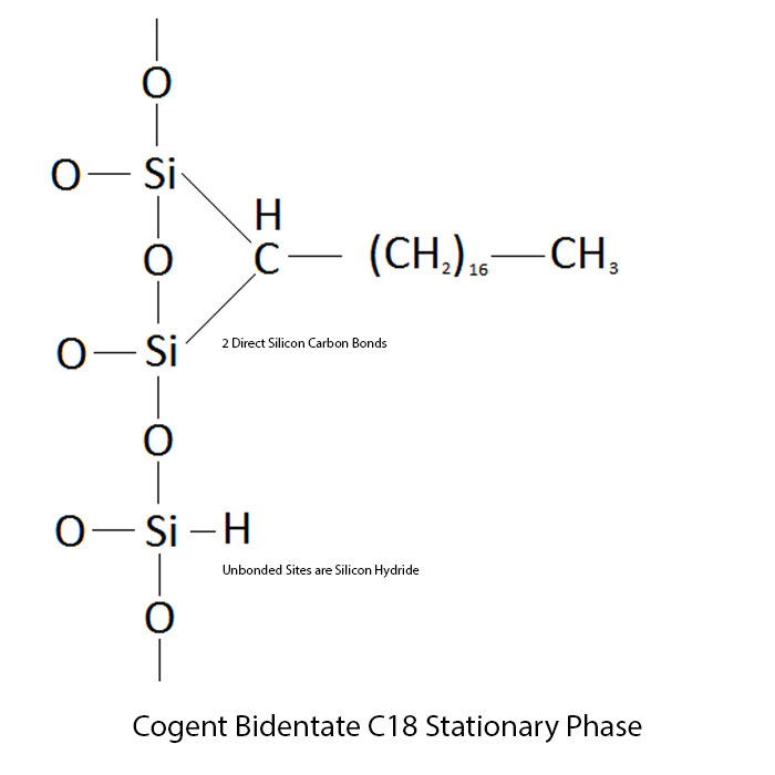 This phase is virtually indestructible due to the direct silicon-carbon bonds achieved when using our proprietary silica and bonding technologies. State of the art 4um or 2.2um high purity silica with a straight chain C18 hydrocarbon is bonded directly to the silica hydride surface with TWO (2) separate points of attachment for long column lifetimes even when using harsh HPLC conditions.