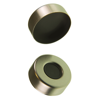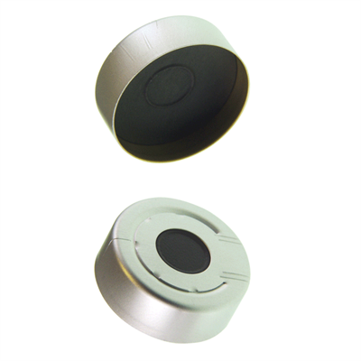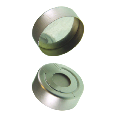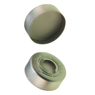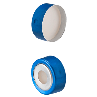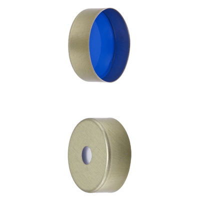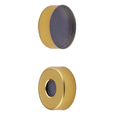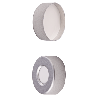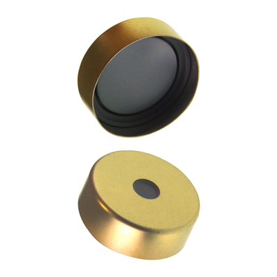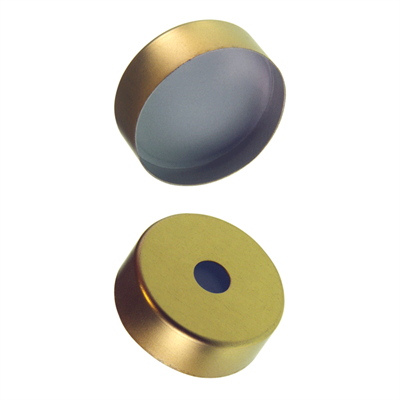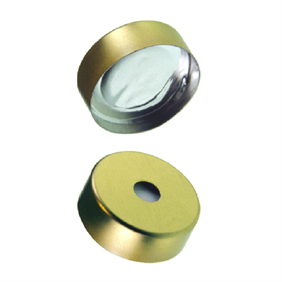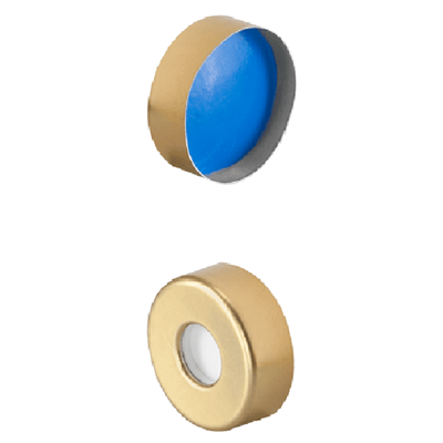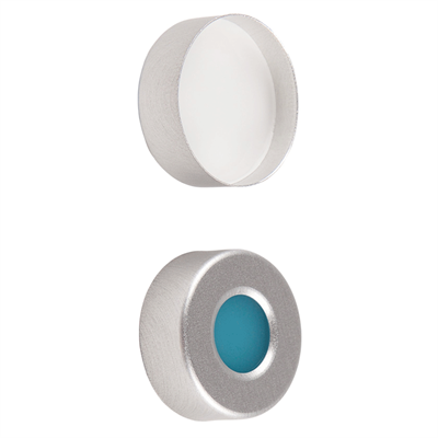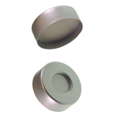 Caps, Headspace, crimp top, with white silicone tubber / natural translucent PTFE, high purity septa, fitted in aluminum silver caps with 10 mm center holes. For use with 20 mm crimp top headspace vials. BASIK brand. 100/PK.
