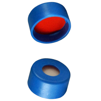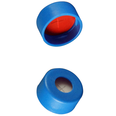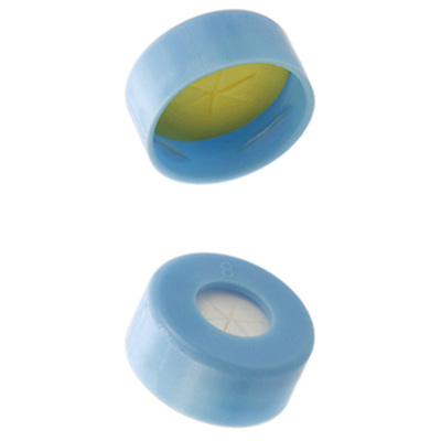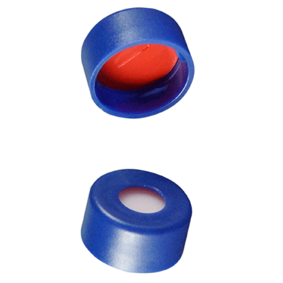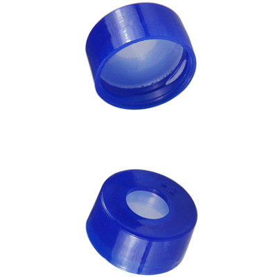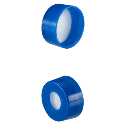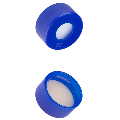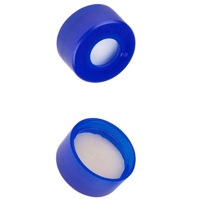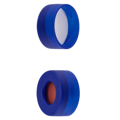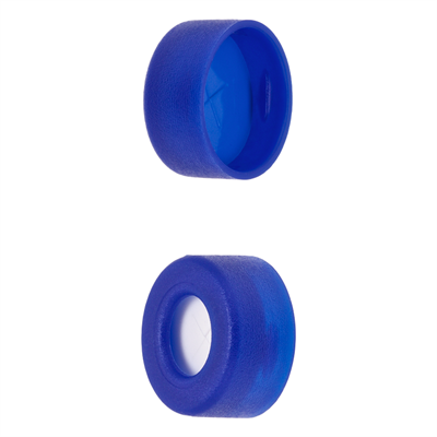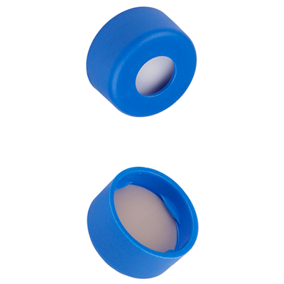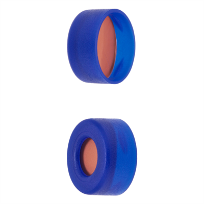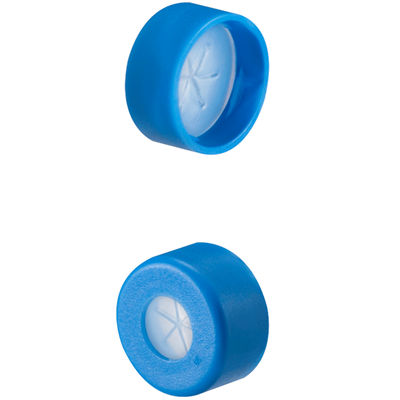 Caps, Snap Top, with White Silicone Rubber / Tan PTFE Septa, fitted in smooth, polyethylene, Blue Caps. For use with 11mm, 12x32mm Snap Top autosampler vials. AQ Brand. 100/PK.