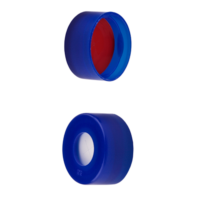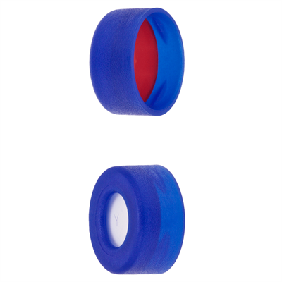 Caps, Snap Top, with Soft-Guard, White Silicone Rubber / Red PTFE Septa, fitted in smooth, polyethylene, Blue Caps. For use with 11mm, 12x32mm Snap Top autosampler vials. Soft-Guard Brand. 100/PK.