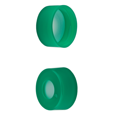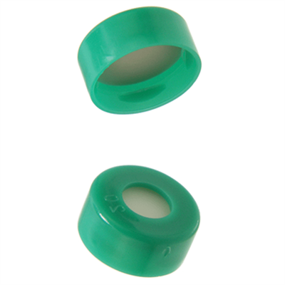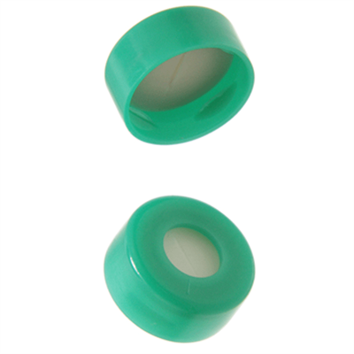 Caps, Snap Top, with Silicone Rubber / PTFE Septa, fitted in smooth, polyethylene, Green Caps. For use with 11mm, 12x32mm Snap Top autosampler vials. MicroSolv Brand. 100/PK.