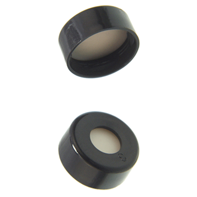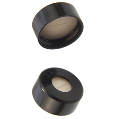Caps, Snap Top, with Silicone Rubber / PTFE Septa, fitted in smooth, polyethylene, Black Caps. For use with 11mm, 12x32mm Snap Top autosampler vials. MicroSolv Brand. 100/PK.