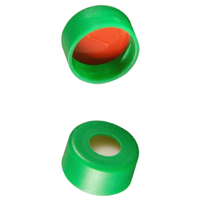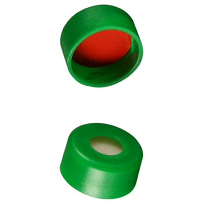 Caps, Snap Top, with Soft-Guard, White Silicone Rubber / Red PTFE Septa, fitted in smooth, polyethylene, Green Caps. For use with 11mm, 12x32mm Snap Top autosampler vials. Soft-Guard Brand. 1000/CS.
