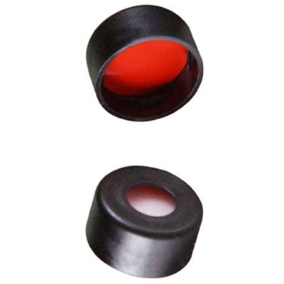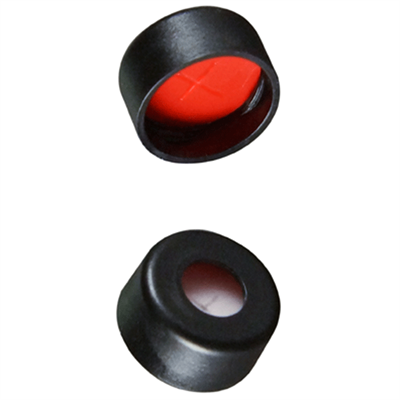 Caps, Snap Top, with Soft-Guard, White Silicone Rubber / Red PTFE Septa, fitted in smooth, polyethylene, Black Caps. For use with 11mm, 12x32mm Snap Top autosampler vials. Soft-Guard Brand. 100/PK.