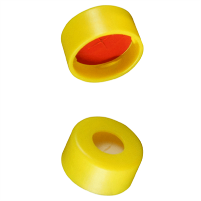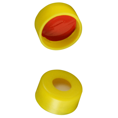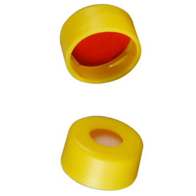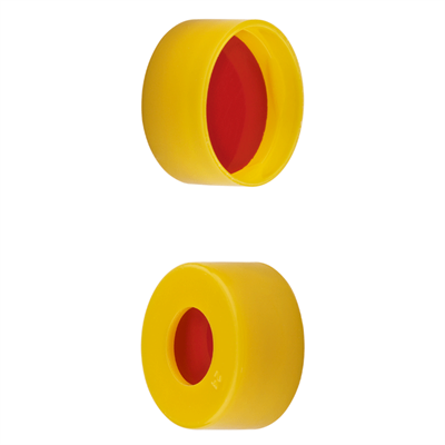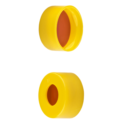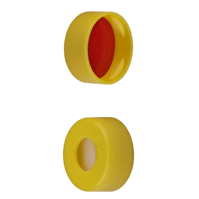 Caps, Snap Top, with Soft-Guard, White Silicone Rubber / Red PTFE Septa, fitted in smooth, polyethylene, Yellow Caps. For use with 11mm, 12x32mm Snap Top autosampler vials. Soft-Guard Brand. 100/PK.