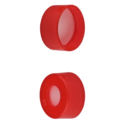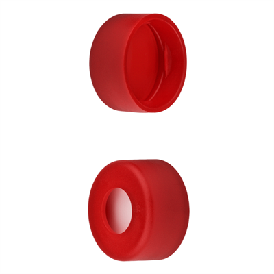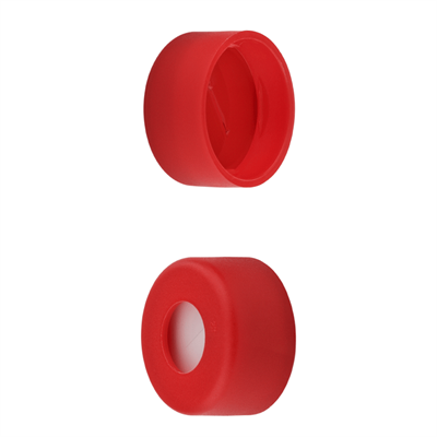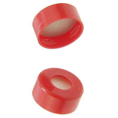 Caps, Snap Top, with Soft-Guard, White Silicone Rubber / Red PTFE Septa, fitted in smooth, polyethylene, Red Caps. For use with 11mm, 12x32mm Snap Top autosampler vials. Soft-Guard Brand. 100/PK.