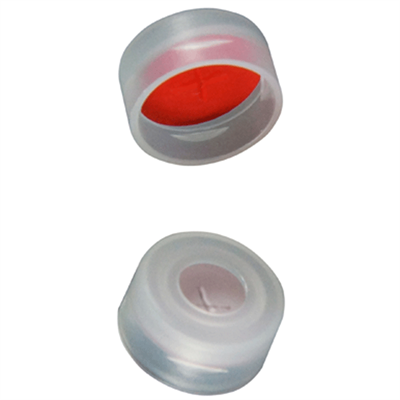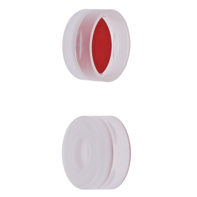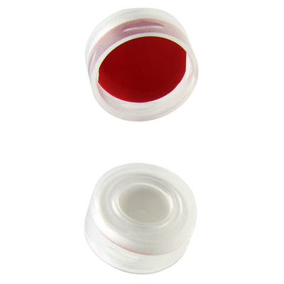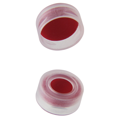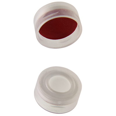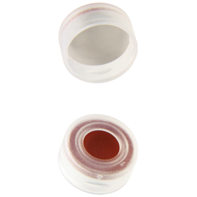 Caps, Snap Top, with Soft-Guard, White Silicone Rubber / Red PTFE Septa, fitted in smooth, polyethylene, Natural Transparent Caps. For use with 11mm, 12x32mm Snap Top autosampler vials. Soft-Guard Brand. 100/PK.