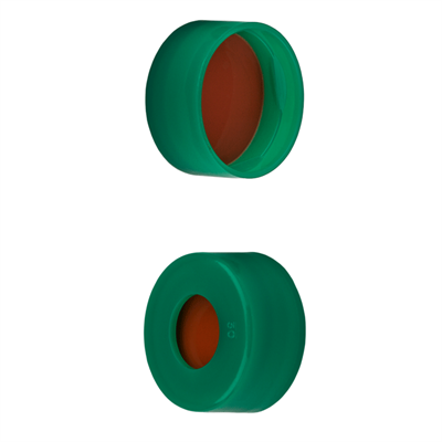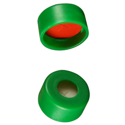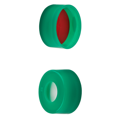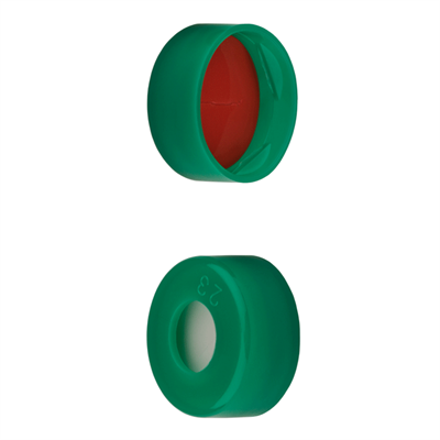 Caps, Snap Top, with Soft-Guard, White Silicone Rubber / Red PTFE Septa, fitted in smooth, polyethylene, Green Caps. For use with 11mm, 12x32mm Snap Top autosampler vials. Soft-Guard Brand. 100/PK.