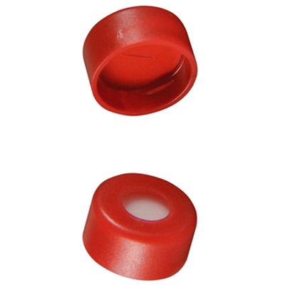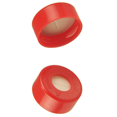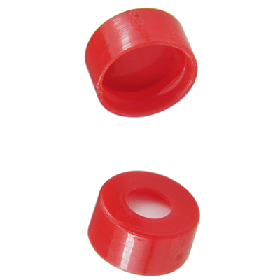 Caps, Snap Top, with White PTFE Septa, fitted in smooth, polyethylene, Red Caps. For use with 11mm, 12x32mm Snap Top autosampler vials. MicroSolv Brand. 100/PK.