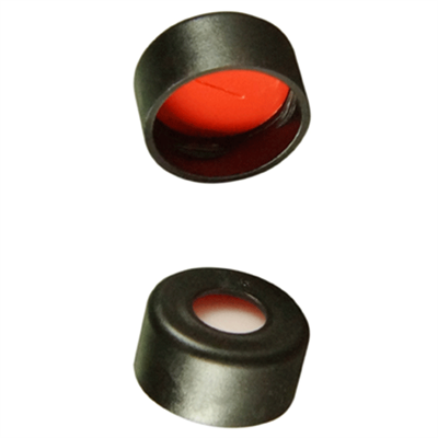 Caps, Snap Top, with Soft-Guard, White Silicone Rubber / Red PTFE Septa, fitted in smooth, polyethylene, Black Caps. For use with 11mm, 12x32mm Snap Top autosampler vials. Soft-Guard Brand. 1000/CS.