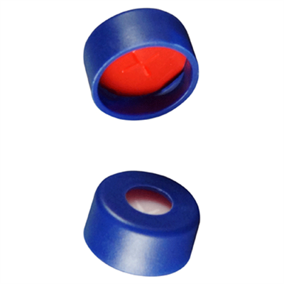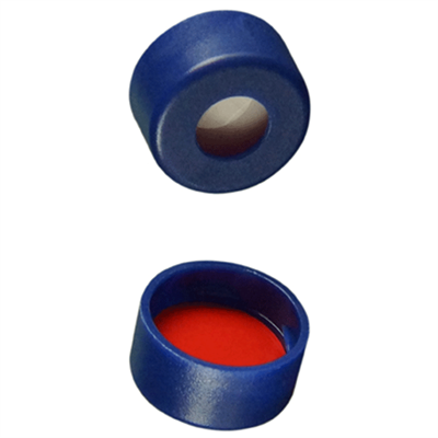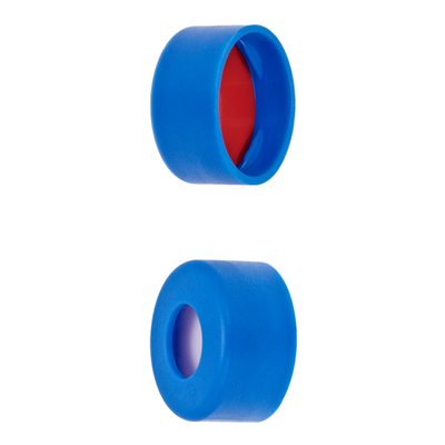 Caps, Snap Top, with Red PTFE / White Silicone Rubber / Red PTFE Septa, fitted in smooth, polyethylene, Blue Caps. For use with 11mm, 12x32mm Snap Top autosampler vials. MicroSolv Brand. 100/PK.