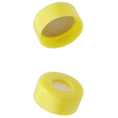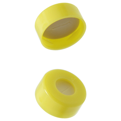 Caps, Snap Top, with Silicone Rubber / PTFE Septa, fitted in smooth, polyethylene, Yellow Caps. For use with 11mm, 12x32mm Snap Top autosampler vials. MicroSolv Brand. 100/PK.