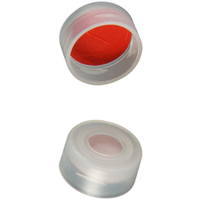 Caps, Snap Top, with Soft-Guard, White Silicone Rubber / Red PTFE Pre-Slit (X Shape) Septa, fitted in smooth, polyethylene, Natural Transparent Caps. For use with 11mm, 12x32mm Snap Top autosampler vials. Soft-Guard Brand. 1000/CS.