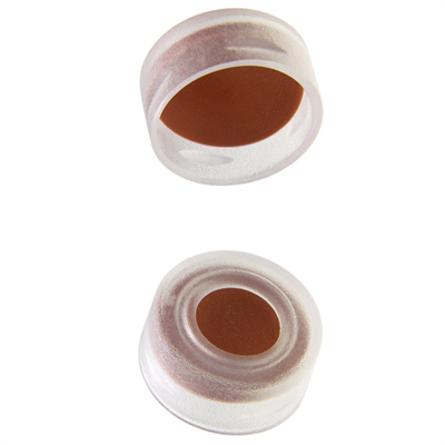 Caps, Snap Top, with 1.0mm thick, Red Rubber / Beige PTFE Septa, fitted in smooth, soft polyethylene, Natural Transparent Caps. For use with 11mm, 12x32mm Snap Top autosampler vials. MicroSolv Brand. 100/PK.