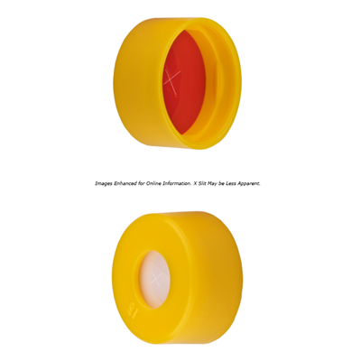 Caps, Snap Top, with Soft-Guard, White Silicone Rubber / Red PTFE Pre-Slit (X Shape) Septa, fitted in smooth, polyethylene, Yellow Caps. For use with 11mm, 12x32mm Snap Top autosampler vials. Soft-Guard Brand. 100/PK.