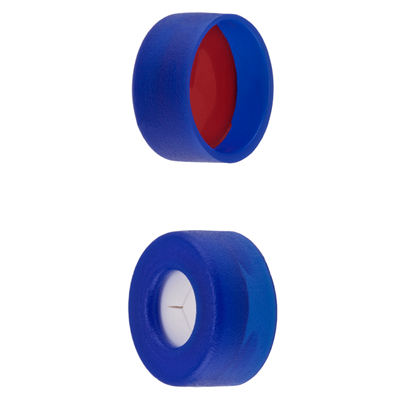 Caps, Snap Top, with Soft-Guard, White Silicone Rubber / Red PTFE Pre-Slit Septa, fitted in smooth, polyethylene Blue Caps. For use with 11mm, 12x32mm Snap Top autosampler vials. Soft-Guard Brand. 100/PK.