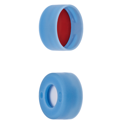 Caps, Snap Top, with Soft-Guard, White Silicone Rubber / Red PTFE Septa, fitted in smooth, polyethylene, Light Blue Caps. For use with 11mm, 12x32mm Snap Top autosampler vials. Soft-Guard Brand. 100/PK.
