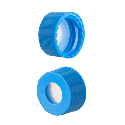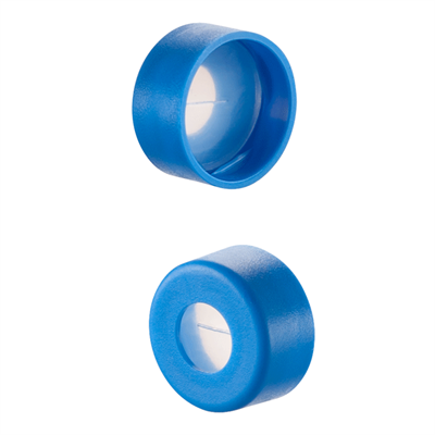 Caps, Screw Top, with Silicone Rubber / PTFE, ultra-pure, Pre-Slit Septa, fitted in "knurled", polypropylene, Light Blue Caps. For use with 9-425mm thread, 12x32mm autosampler vials. AQR Brand. 100/PK.