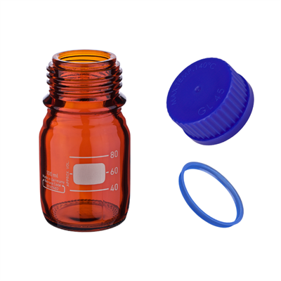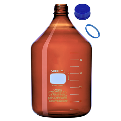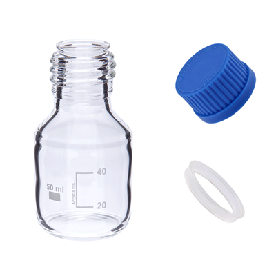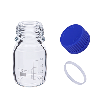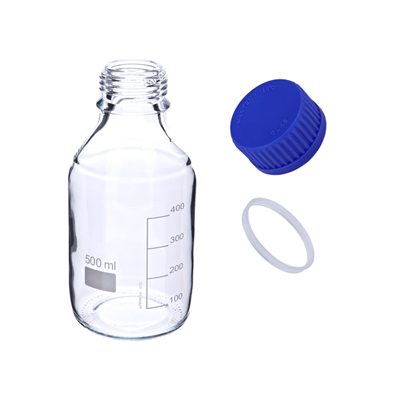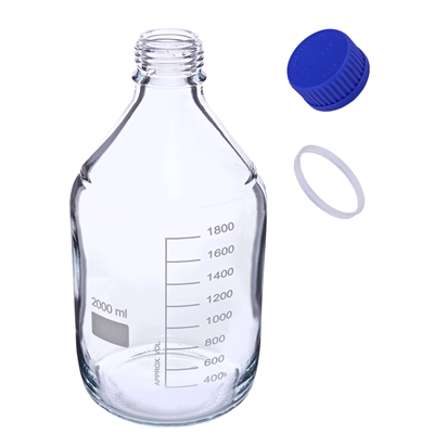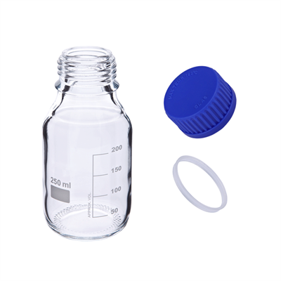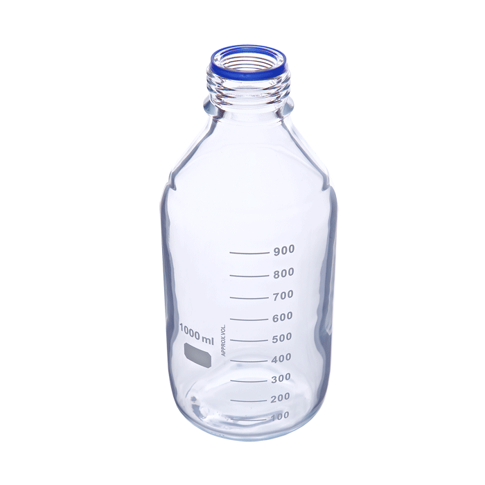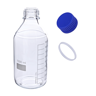 Supplied with white enamel markings, a solid blue cap and a drip free sealing ring. Other colored, solid caps are available. These bottles are also useful as biocompatible media bottles.