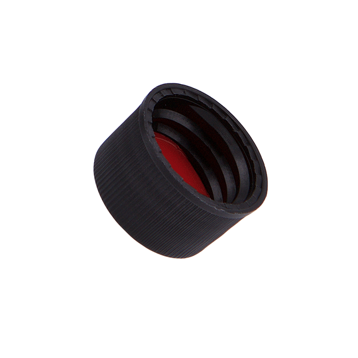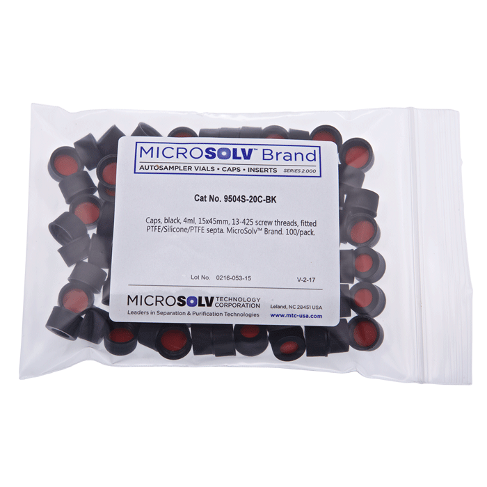Caps, Screw Top, with PTFE / Silicone Rubber / PTFE Septa, fitted in "knurled", polypropylene, Black Caps. For use with 13-425mm thread, 15x45mm autosampler vials. MicroSolv Brand. 100/PK.