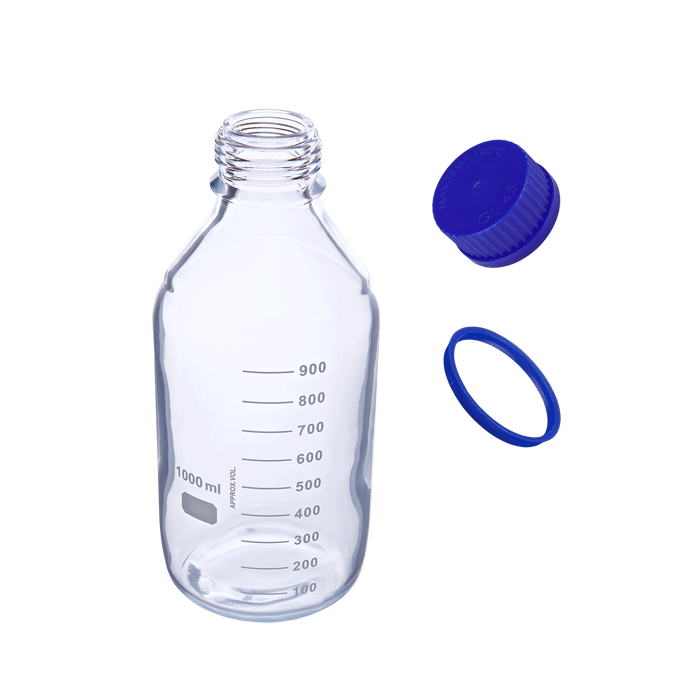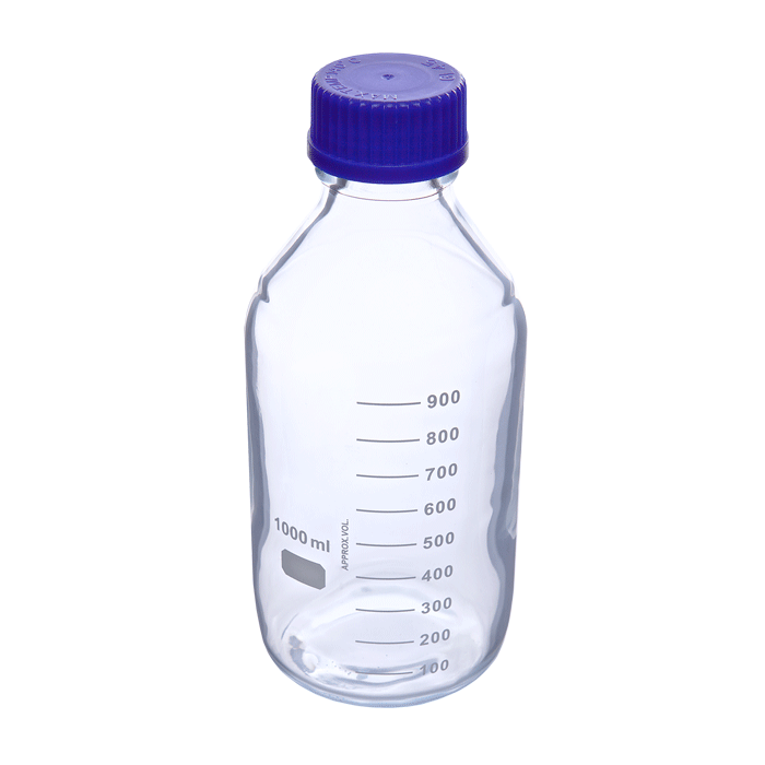 This Clear, Plastic Coated Borosilicate Glass Bottle has a 1L "Total Fill Capacity" and is perfect as an HPLC Mobile Phase Reservoir. The small opening, one liter Capacity and White Enamel Graduations on the outside of the Bottle help you determine the Solvent use and prevent running dry.