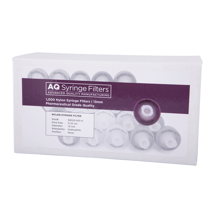 Advanced Quality Nylon-66 Syringe Filters, AQ™ brand, for Pharmaceutical Grade HPLC & Dissolution Testing. Manufactured with a unique 0.22µm nylon-66 membrane in a 13mm polypropylene housing, these syringe filters are made for laboratories that require consistent, high performance results with ease of use especially during high volume work. Excellent choice when laboratories cannot afford poor chromatographic results.