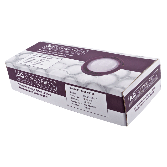 Advanced Quality Nylon-66 Syringe Filters, AQ™ brand, for Pharmaceutical Grade HPLC & Dissolution Testing. Manufactured with a unique 0.22µm nylon-66 membrane in a 25mm polypropylene housing, these syringe filters are made for laboratories that require consistent, high performance results with ease of use especially during high volume work. Excellent choice when laboratories cannot afford poor chromatographic results.