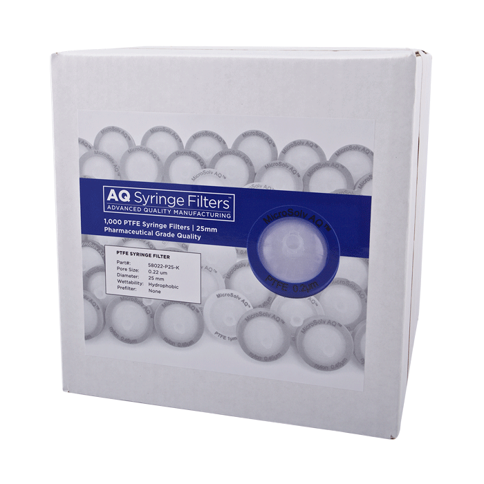 Advanced Quality PTFE Syringe Filters, AQ™ brand, for Pharmaceutical Grade HPLC & Dissolution Testing. Manufactured with a unique 0.22µm PTFE or Polytetrafluoroethylene (purest form of Teflon©) in a 25mm polypropylene housing, these syringe filters are made for laboratories that require consistent, high performance results with ease of use especially during high volume work. Excellent choice when laboratories cannot afford poor chromatographic results.