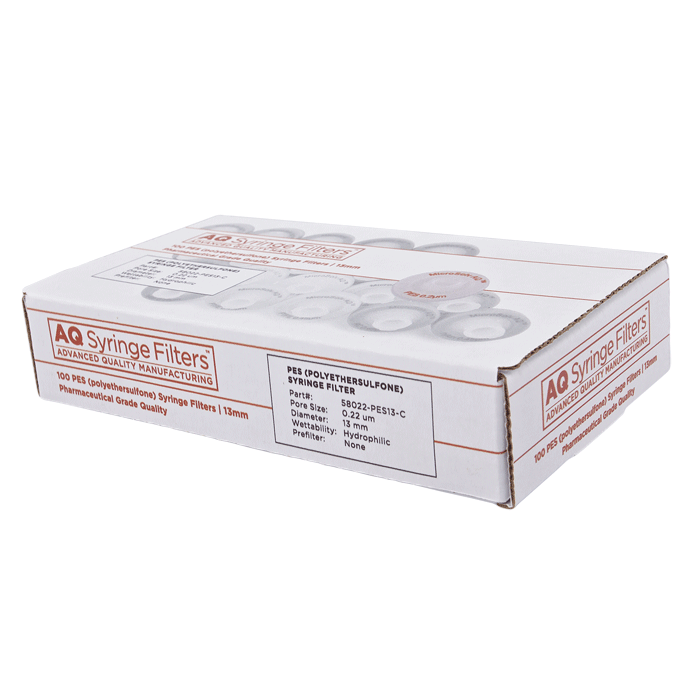 Advanced Quality Polyethersulfone (PES) Syringe Filters, AQ™ brand, for Pharmaceutical Grade HPLC & Dissolution Testing. Manufactured with a unique 0.22µm PES membrane in a 13mm polypropylene housing, these syringe filters are made for laboratories that require consistent, high performance results with ease of use especially during high volume work. Excellent choice when laboratories cannot afford poor chromatographic results.