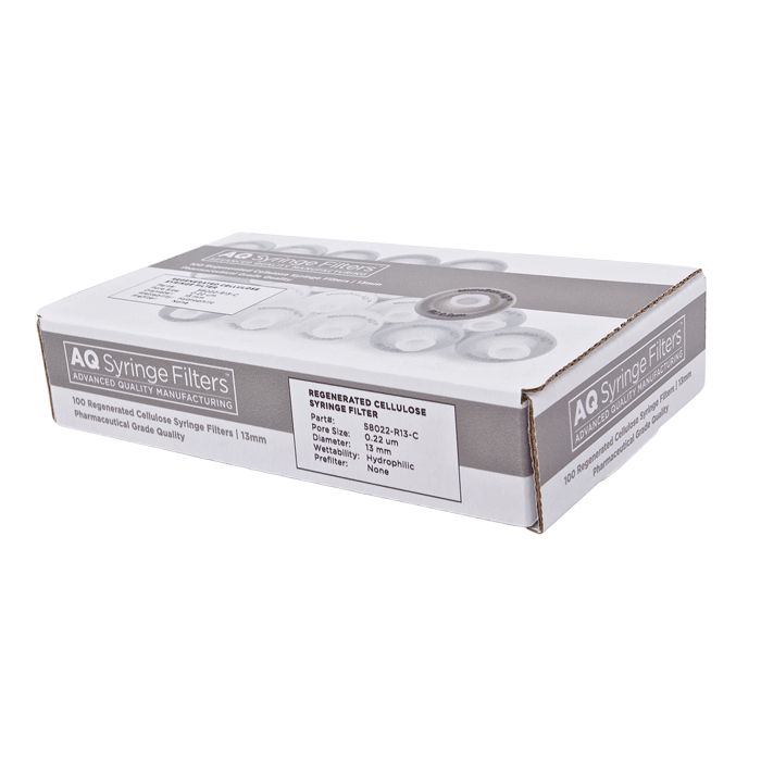 Advanced Quality Regenerated Cellulose Syringe Filters, AQ™ brand, for Pharmaceutical Grade HPLC & Dissolution Testing. Manufactured with a unique 0.22µm Regenerated Cellulose Membrane in a 13mm polypropylene housing, these syringe filters are made for laboratories that require consistent, high performance results with ease of use especially during high volume work. Excellent choice when laboratories cannot afford poor chromatographic results.