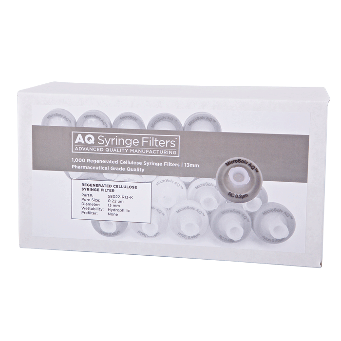 Advanced Quality Regenerated Cellulose Syringe Filters, AQ™ brand, for Pharmaceutical Grade HPLC & Dissolution Testing. Manufactured with a unique 0.22µm Regenerated Cellulose Membrane in a 13mm polypropylene housing, these syringe filters are made for laboratories that require consistent, high performance results with ease of use especially during high volume work. Excellent choice when laboratories cannot afford poor chromatographic results.