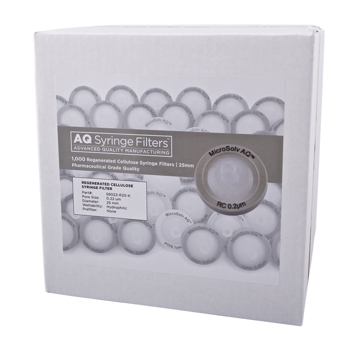 Advanced Quality Regenerated Cellulose Syringe Filters, AQ™ brand, for Pharmaceutical Grade HPLC & Dissolution Testing. Manufactured with a unique 0.22µm Regenerated Cellulose Membrane in a 25mm polypropylene housing. These syringe filters are made for laboratories that require consistent, high performance results with ease of use especially during high volume work. Excellent choice when laboratories cannot afford poor chromatographic results.