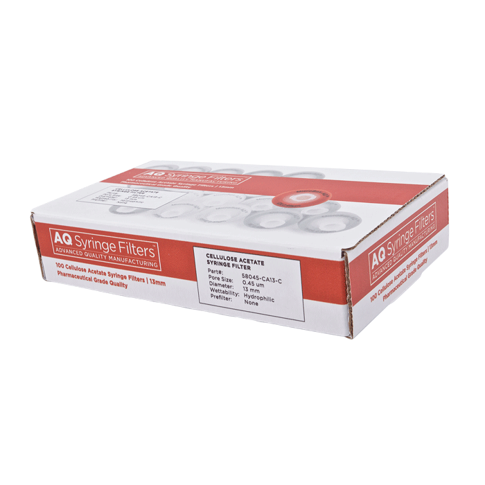 Advanced Quality Cellulose Acetate (CA) Syringe Filters, AQ™ brand, for Pharmaceutical Grade HPLC & Dissolution Testing. Manufactured with a 0.45µm Cellulose Acetate Membrane in a 13mm polypropylene housing. These syringe filters are made for laboratories that require consistent, high performance results with ease of use especially during high volume work. Excellent choice when laboratories cannot afford poor Chromatographic results.