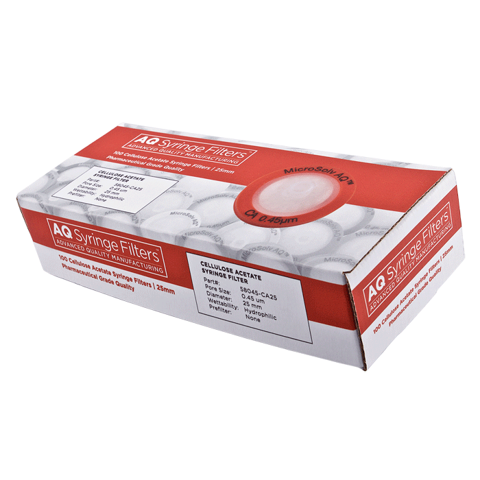 Advanced Quality Cellulose Acetate Syringe Filters, AQ™ brand, for Pharmaceutical Grade HPLC & Dissolution Testing. Manufactured with a 0.45µm Cellulose Acetate Membrane in a 25mm polypropylene housing. These syringe filters are made for laboratories that require consistent, high performance results with ease of use especially during high volume work. Excellent choice when laboratories cannot afford poor Chromatographic results.