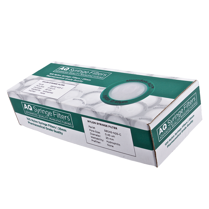 Advanced Quality Nylon-66 Syringe Filters, AQ™ brand, for Pharmaceutical Grade HPLC & Dissolution Testing. Manufactured with a unique 0.45µm nylon-66 membrane in a 25mm polypropylene housing, these syringe filters are made for laboratories that require consistent, high performance results with ease of use especially during high volume work. Excellent choice when laboratories cannot afford poor chromatographic results.