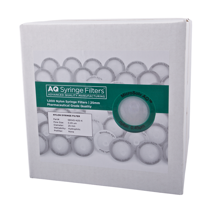 Advanced Quality Nylon-66 Syringe Filters, AQ™ brand, for Pharmaceutical Grade HPLC & Dissolution Testing. Manufactured with a unique 0.45µm nylon-66 membrane in a 25mm polypropylene housing, these syringe filters are made for laboratories that require consistent, high performance results with ease of use especially during high volume work. Excellent choice when laboratories cannot afford poor chromatographic results.