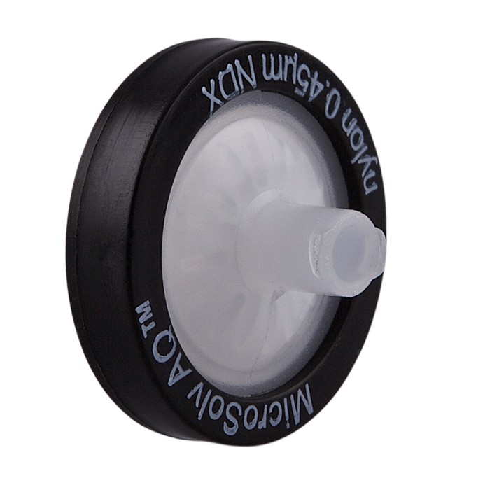 Syringe Filters, 25mm, Nylon, w/ Multi-Depth Pre Filters, 0.45um Final Pore Size. Black with White Polypropylene, AQ Brand. 100/PK.