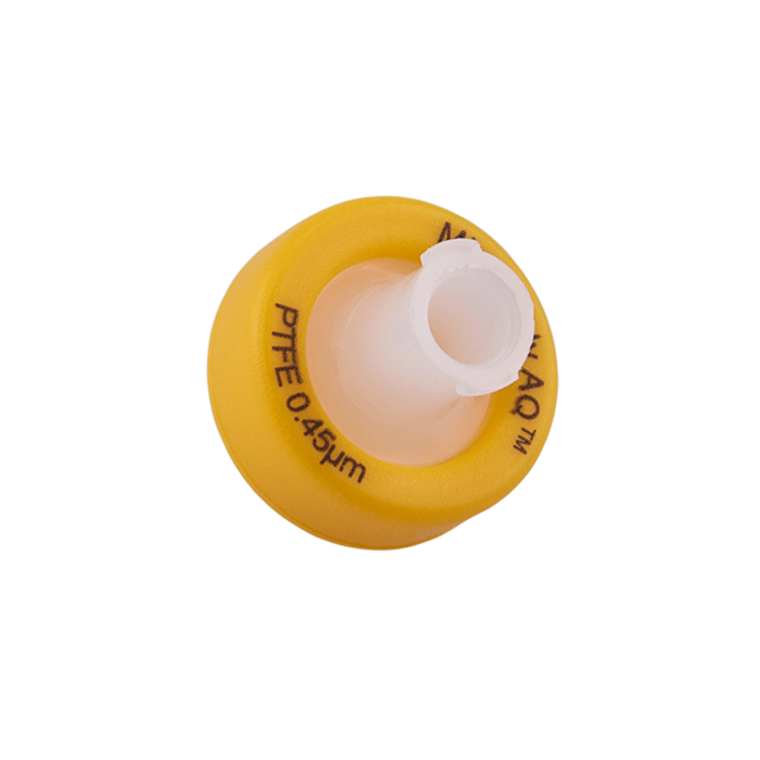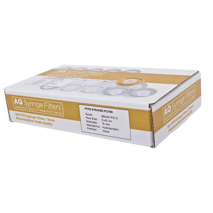 Advanced Quality PTFE Syringe Filters, AQ™ brand, for Pharmaceutical Grade HPLC & Dissolution Testing. Manufactured with a unique 0.45µm PTFE or Polytetrafluoroethylene (purest form of Teflon©) in a 13mm polypropylene housing, these syringe filters are made for laboratories that require consistent, high performance results with ease of use especially during high volume work. Excellent choice when laboratories cannot afford poor chromatographic results.
