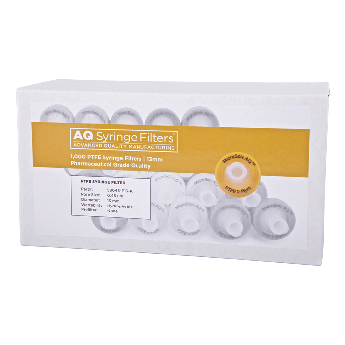 Advanced Quality PTFE Syringe Filters, AQ™ brand, for Pharmaceutical Grade HPLC & Dissolution Testing. Manufactured with a unique 0.45µm PTFE or Polytetrafluoroethylene (purest form of Teflon©) in a 13mm polypropylene housing, these syringe filters are made for laboratories that require consistent, high performance results with ease of use especially during high volume work. Excellent choice when laboratories cannot afford poor chromatographic results.