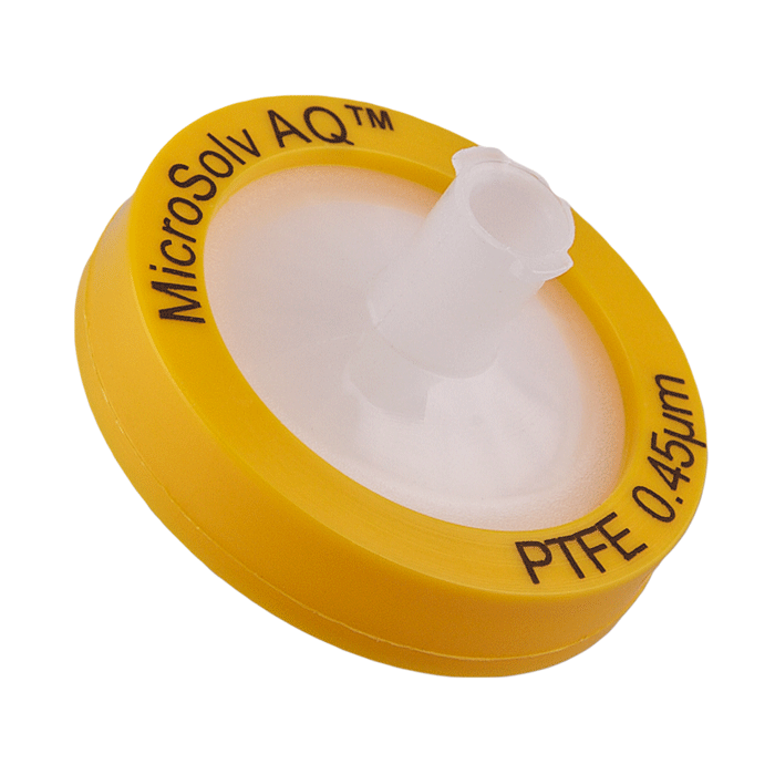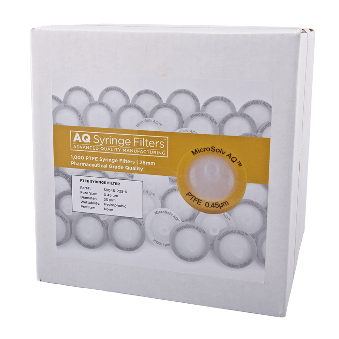 Advanced Quality PTFE Syringe Filters, AQ™ brand, for Pharmaceutical Grade HPLC & Dissolution Testing. Manufactured with a unique 0.45µm PTFE or Polytetrafluoroethylene (purest form of Teflon©) in a 25mm polypropylene housing, these syringe filters are made for laboratories that require consistent, high performance results with ease of use especially during high volume work. Excellent choice when laboratories cannot afford poor chromatographic results.