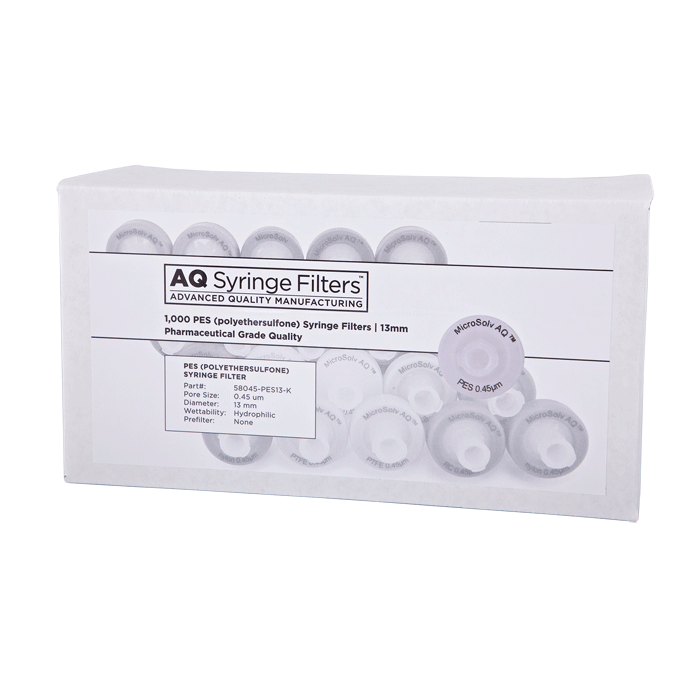 Advanced Quality Polyethersulfone (PES) Syringe Filters, AQ™ brand, for Pharmaceutical Grade HPLC & Dissolution Testing. Manufactured with a unique 0.45µm PES membrane in a 13mm polypropylene housing, these syringe filters are made for laboratories that require consistent, high performance results with ease of use especially during high volume work. Excellent choice when laboratories cannot afford poor chromatographic results.