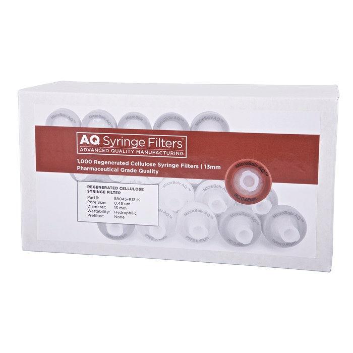 Advanced Quality Regenerated Cellulose Syringe Filters, AQ™ brand, for Pharmaceutical Grade HPLC & Dissolution Testing. Manufactured with a unique 0.45µm Regenerated Cellulose Membrane in a 13mm polypropylene housing, these syringe filters are made for laboratories that require consistent, high performance results with ease of use especially during high volume work. Excellent choice when laboratories cannot afford poor chromatographic results.