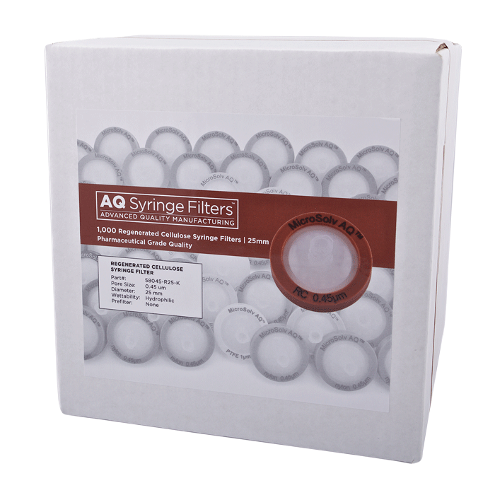 Advanced Quality Regenerated Cellulose Syringe Filters, AQ™ brand, for Pharmaceutical Grade HPLC & Dissolution Testing. Manufactured with a unique 0.45µm Regenerated Cellulose Membrane in a 25mm polypropylene housing. These syringe filters are made for laboratories that require consistent, high performance results with ease of use especially during high volume work. Excellent choice when laboratories cannot afford poor chromatographic results.