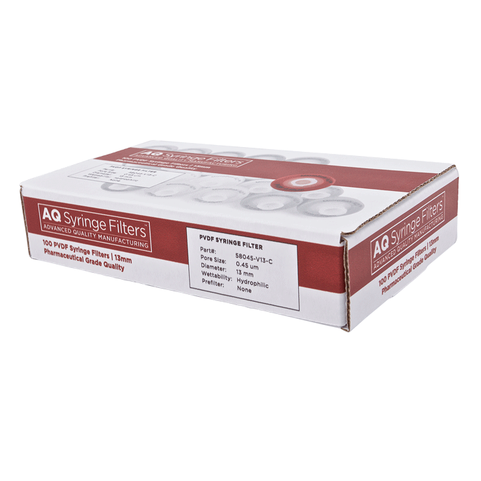 Advanced Quality Polyvinylidene Fluoride (PVDF) Syringe Filters, AQ™ brand, for Pharmaceutical Grade HPLC & Dissolution Testing. Manufactured with a unique 0.45µm PVDF membrane in a 13mm polypropylene housing, these syringe filters are made for laboratories that require consistent, high performance results with ease of use especially during high volume work. Excellent choice when laboratories cannot afford poor chromatographic results