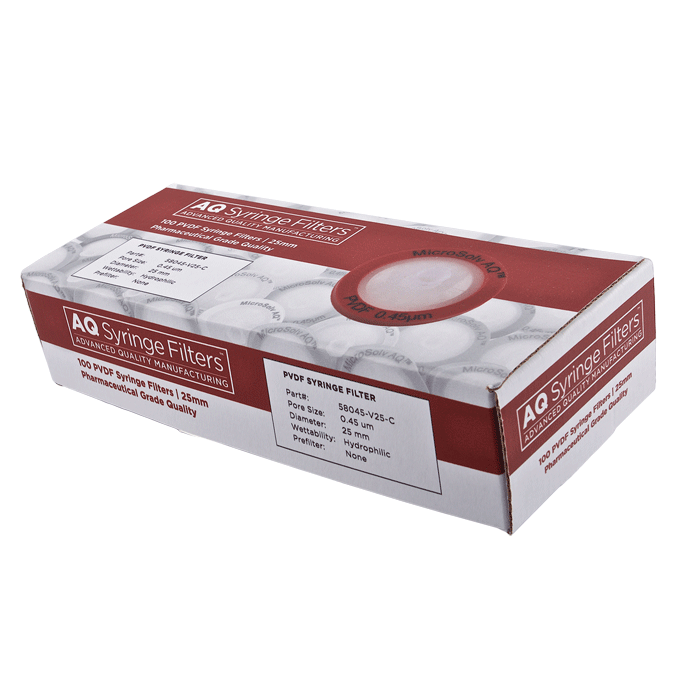 Advanced Quality Polyvinylidene Fluoride (PVDF) Syringe Filters, AQ™ brand, for Pharmaceutical Grade HPLC & Dissolution Testing. Manufactured with a unique 0.45µm PVDF membrane in a 25mm polypropylene housing, these Syringe Filters are made for Laboratories that require consistent, high performance results with ease of use especially during high volume work. Excellent choice when laboratories cannot afford poor Chromatographic results.
