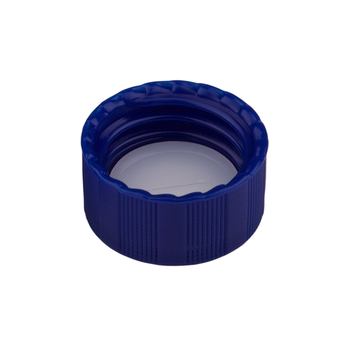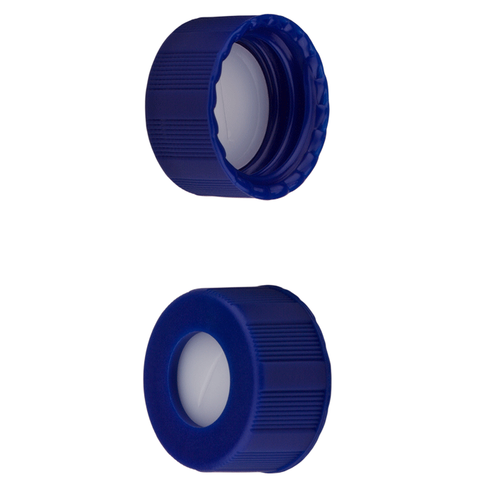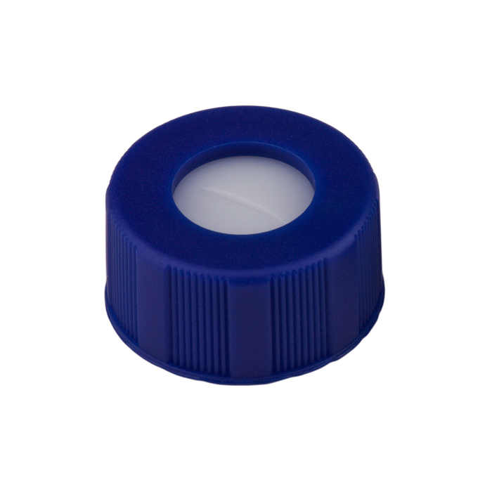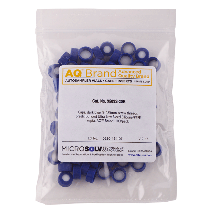 Caps, Screw Top, with White Silicone Rubber / White PTFE, ultra-low bleed, Pre-Slit Septa, bonded in "knurled", polypropylene, Dark Blue Caps. For use with 9-425mm thread, 12x32mm autosampler vials. AQ Brand. 100/PK