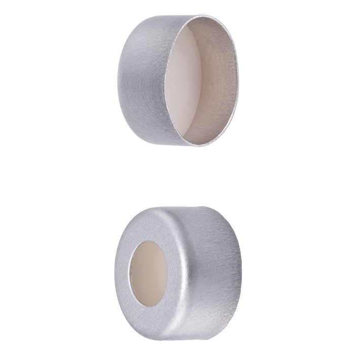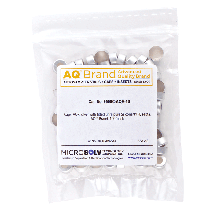 Caps, Crimp Top, Silicone Rubber / PTFE, ultra-pure Septa, fitted in aluminum, Silver Caps. For use with 11mm Crimp or Snap Top, 12x32mm autosampler vials. AQR Brand. 100/PK.