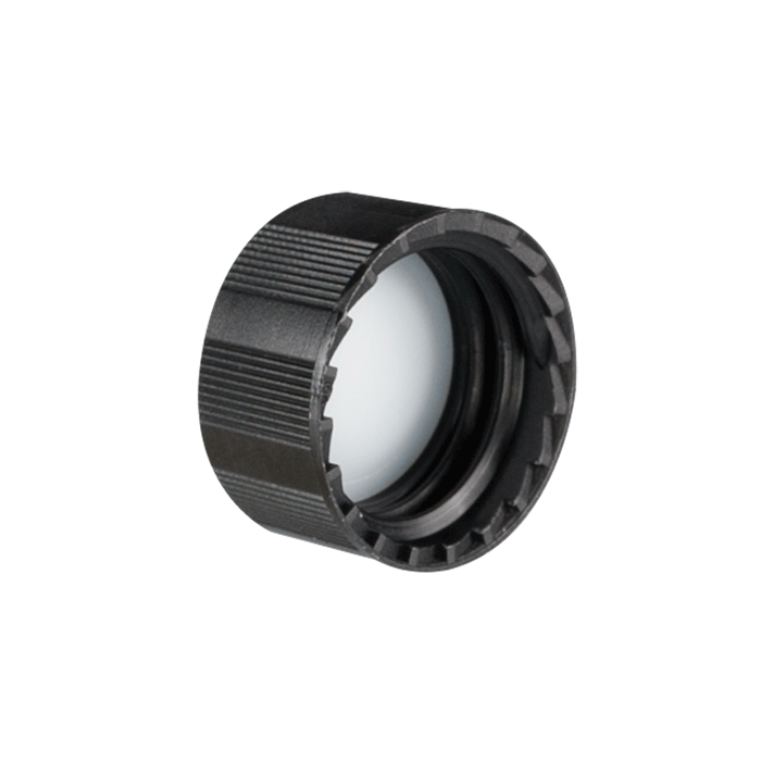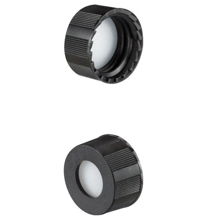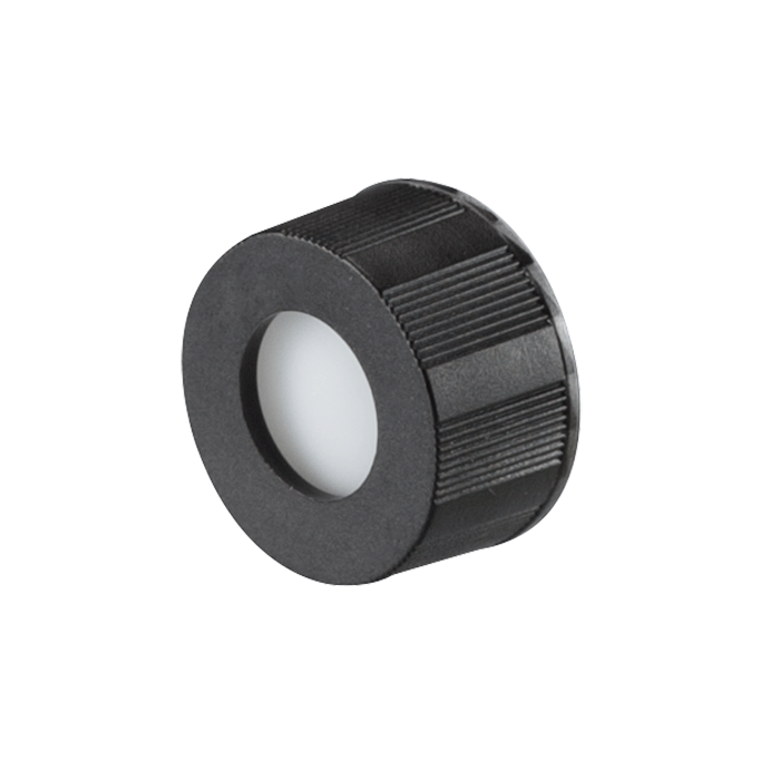Caps, Screw Top, with PTFE, ultra-pure Septa, fitted in "knurled", polypropylene, Black Caps. For use with 9-425mm thread, 12x32mm autosampler vials. AQ Brand. 100/PK