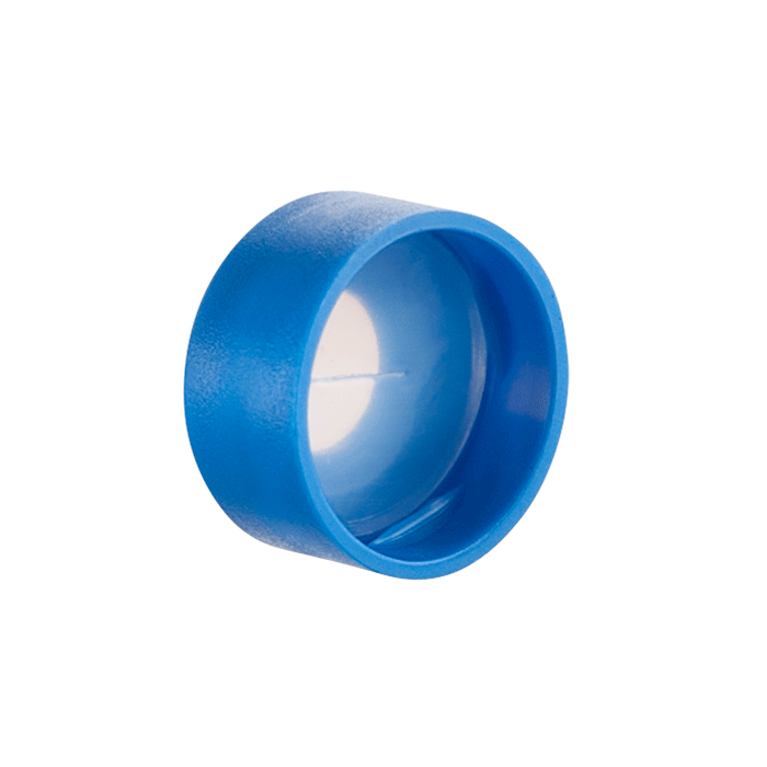 Caps, Snap Top, with Silicone Rubber / PTFE, ultra-pure, Pre-Slit Septa, fitted in smooth, polyethylene, Light Blue Caps. For use with 11mm, 12x32mm, Snap Top autosampler vials. AQR Brand. 100/PK.