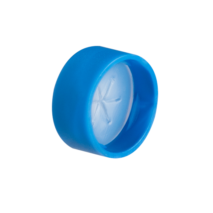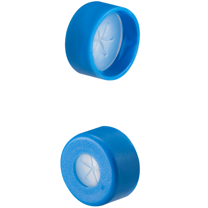 Caps, Snap Top, with Silicone Rubber / PTFE, ultra-pure, Pre-Slit (Star Shape) Septa, fitted in smooth, polyethylene, Light Blue Caps. For use with 11mm, 12x32mm, Snap Top autosampler vials. AQR Brand. 100/PK.